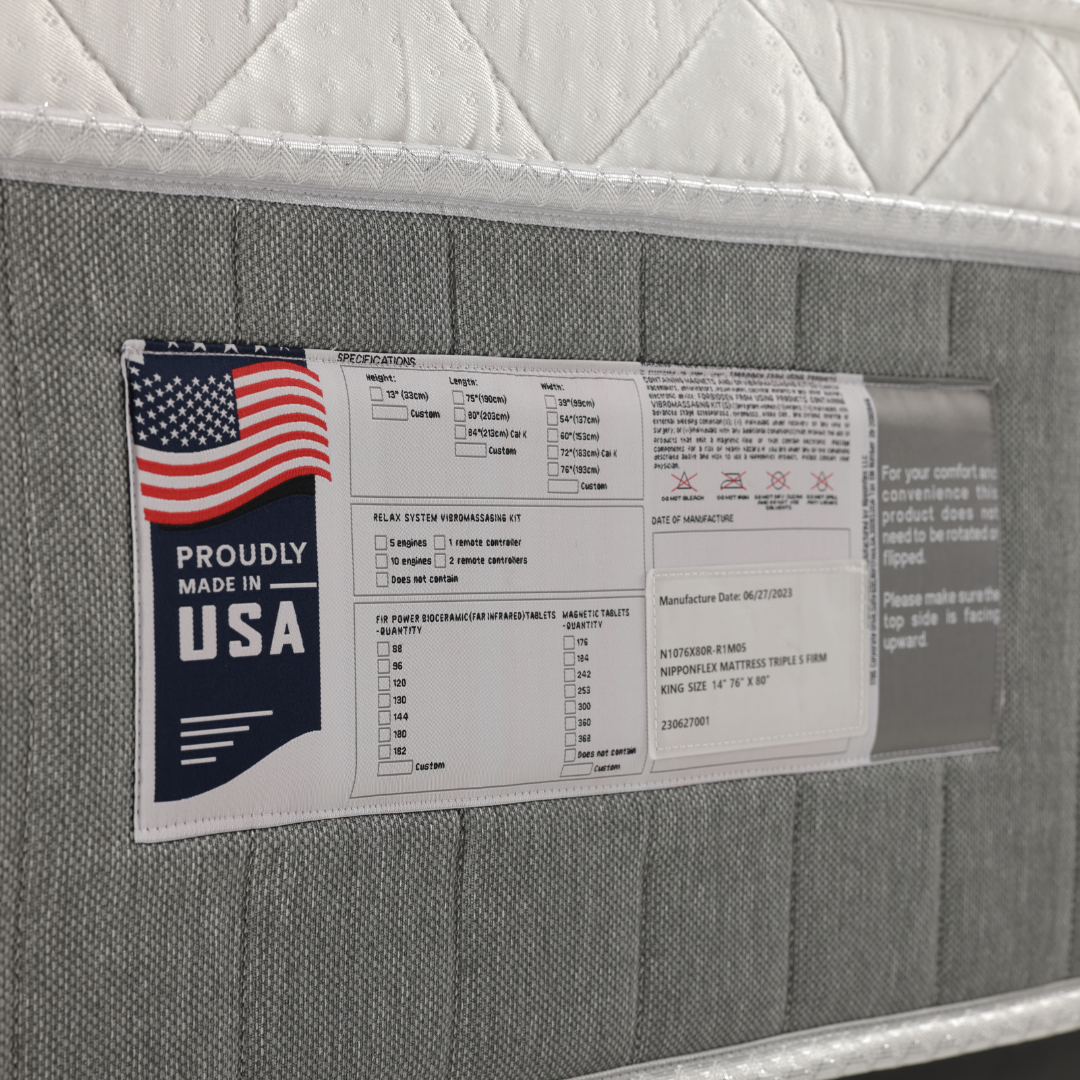 Introducing the Nipponflex Triple S Firm mattress, the most advanced orthopedic mattress in the market. This mattress is not only the largest product with FIR POWER on the planet, but it also consists of 10 layers that combine comfort, orthopedics, and health benefits. Despite its name suggesting firmness, you can choose the soft version, which will still provide orthopedic support tailored to your needs. All our mattresses are proudly made in the United States.